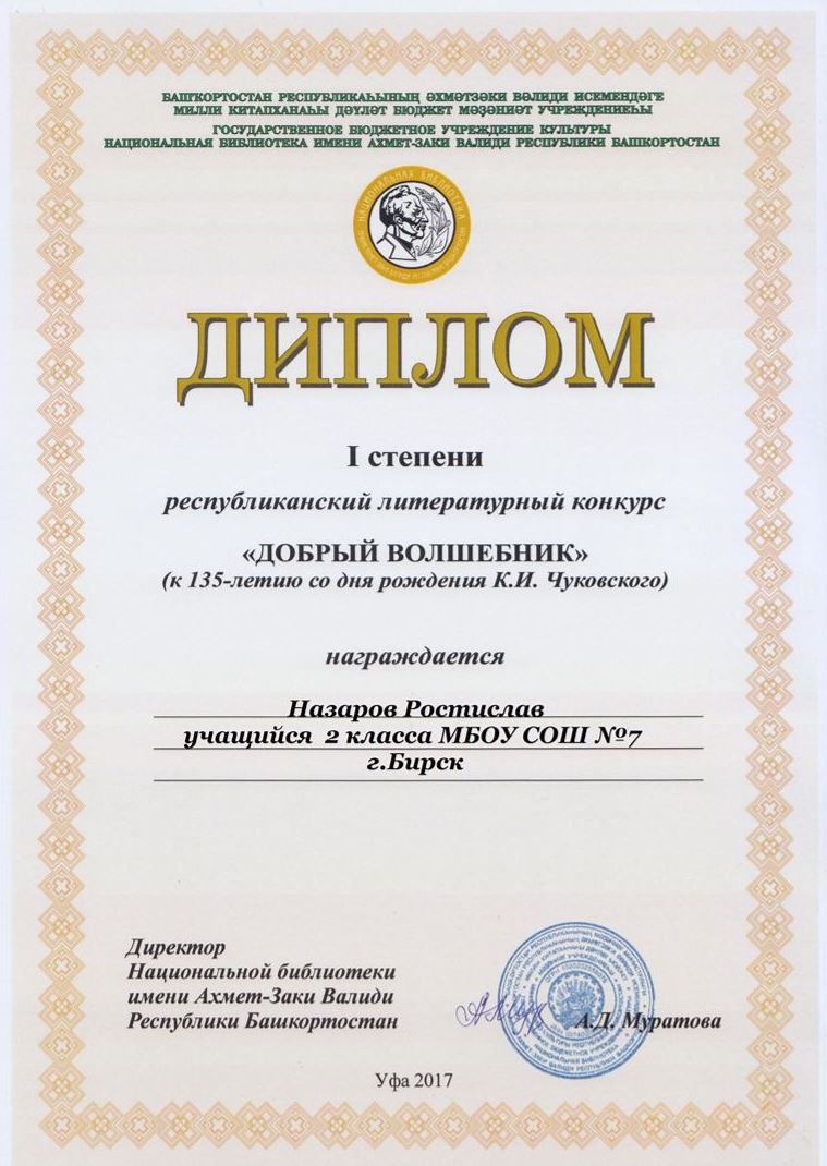 Подведены итоги Республиканского литературного конкурса «Добрый волшебник», посвященного 135-летию со дня рождения К. И. Чуковского. Инициатором и учредителем конкурса выступила Национальная библиотека имени Ахмет-Заки Валиди Республики Башкортостан. Он проходил с 1 февраля по 31 марта 2017 года среди дошкольников, учащихся 1-2 классов – пользователей общедоступных библиотек республики, воспитанников ДОУ, учащихся образовательных организаций, внешкольных учебных заведений, учреждений дополнительного образования. Всего на конкурс было направлено 253 работы из районов и городов республики.
